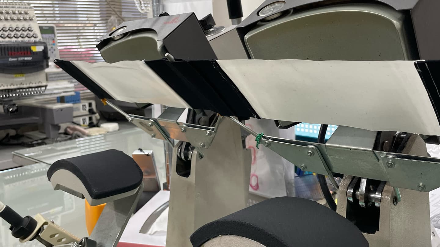 プロ仕様の圧着器です。衣服生地専用の熱転写シート、カラーマーク、昇華等に威力を発揮します。4台圧着器が毎日フル稼働しています。