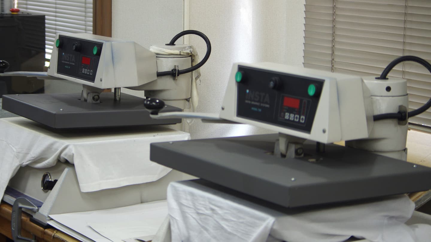 プロ仕様の圧着器です。衣服生地専用の熱転写シート、カラーマーク、昇華等に威力を発揮します。4台圧着器が毎日フル稼働しています。